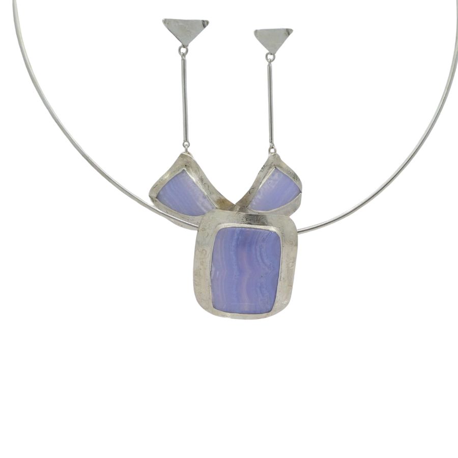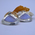 Like ripples in the waves, these cornflower blue agates capture a timeless moment in nature. Set in triangular silver frames, shaped and hammered with a wave motif, these earrings will be a beautiful accessory throughout the summer. The earrings hang 6.0 cm from the earring stud to the base of the triangle, and the width of the triangle is 4cm. There is a similar crazy lace agate pendant which may be of interest.